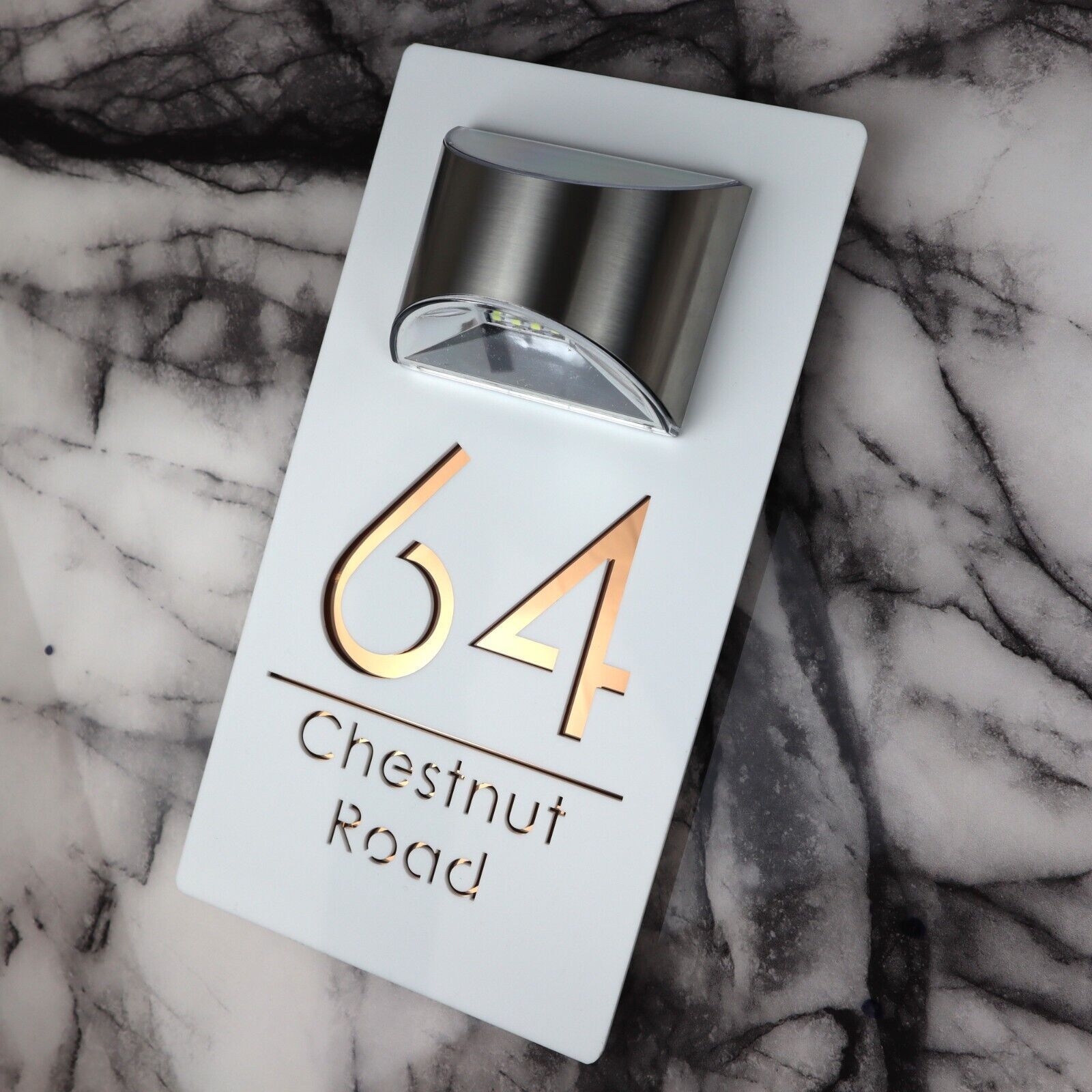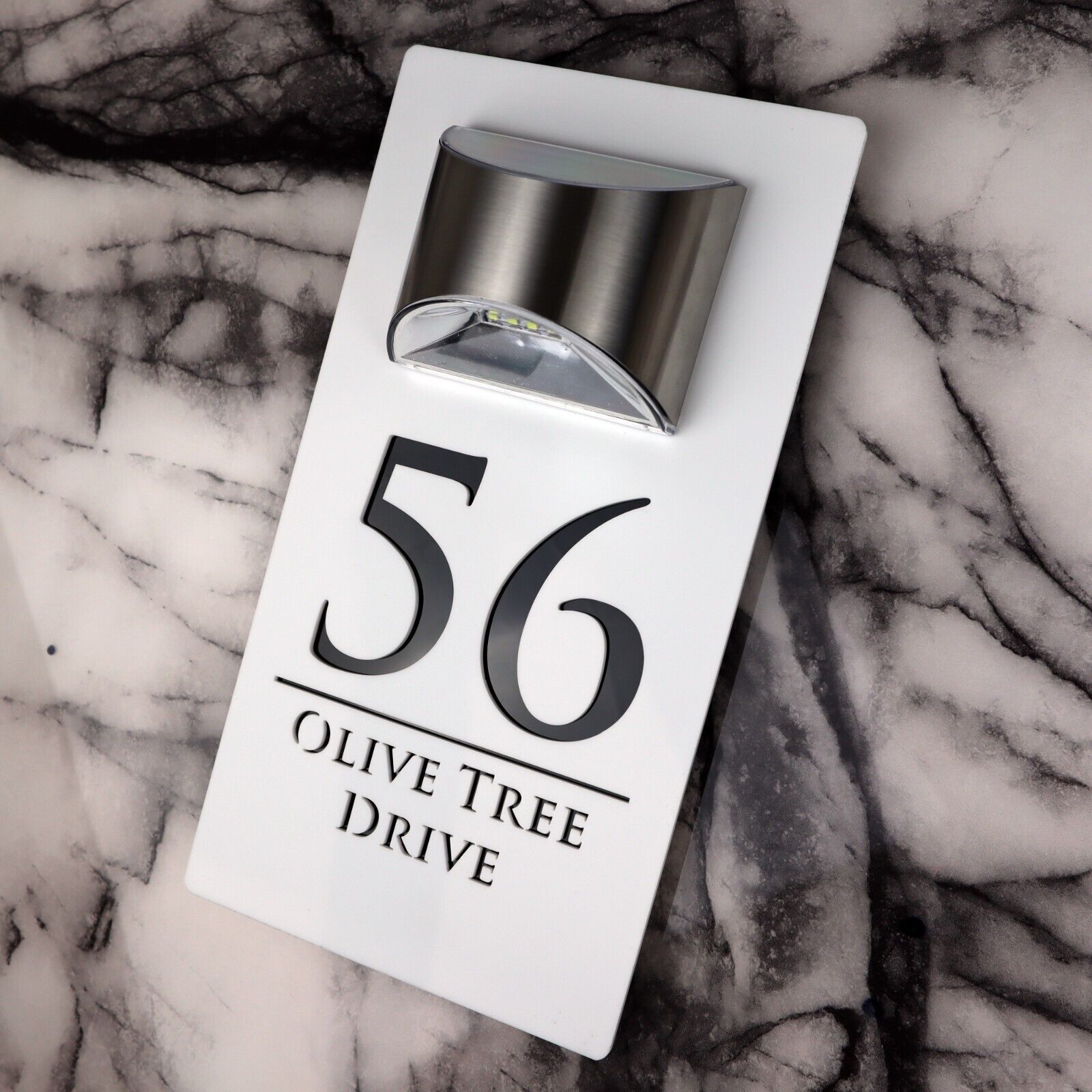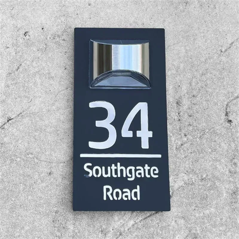 Dieses Hausschild besteht aus langlebigen Materialien und integriert nahtlos Solartechnologie. Personalisieren Sie es mit Ihrer Hausnummer und Ihrem Straßennamen.